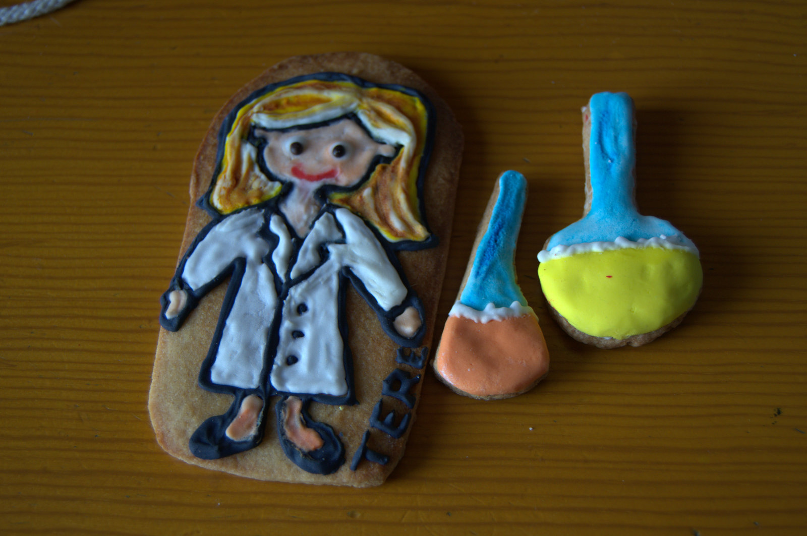 En este caso la que más me gusta es la del lápiz; y la verdad es que con fondant quedan más bonitas, a mi me gustan más, y ya los detalles con glasa, más que toda la galleta hecha con glasa, ¿qué os parece?