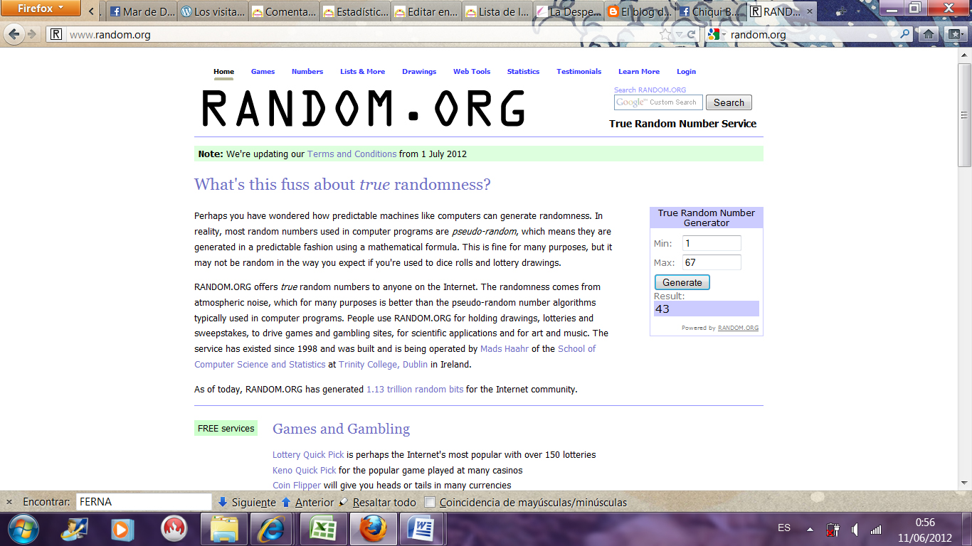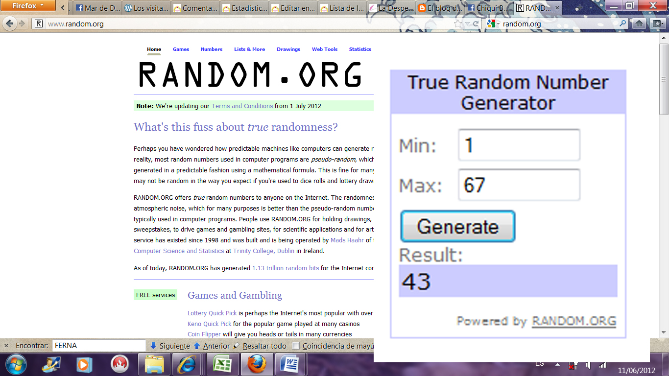 Para hacerlo de la forma más correcta posible voy a utilizar, como las veces anteriores, el sitio Random.org, creado para hacer selecciones al azar de forma transparente, ideal para sorteos on-line. El procedimiento es el siguiente: primero se crea una lista de concursantes asignando un número a cada uno (que publicaré en el blog para que todos podáis verla); después se indica el número de ganadores, es decir, uno; y por último, el número de concursantes; y listo, el programa elige uno al azar!
