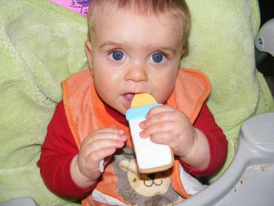 Y ésta es la foto de su hijo comiéndose la galleta del biberón, qué gracioso! espero que le gustase.