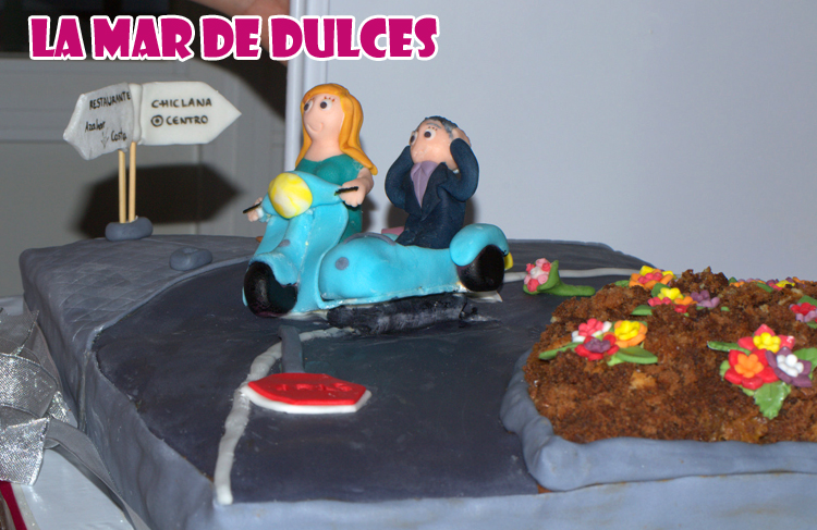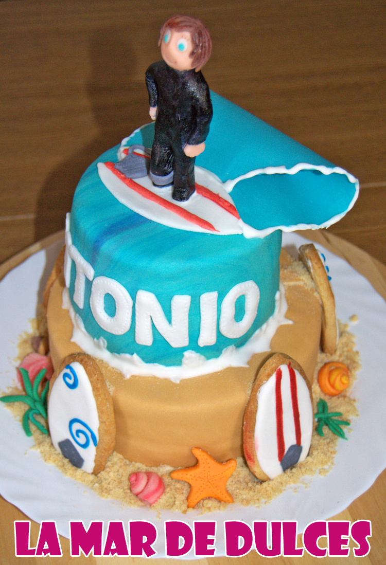 En el piso de arriba, el del mar, puse a Antonio surfeando. Mi idea era que estuviese bajo la ola, pero como me la encargaron el día anterior no dio tiempo suficiente a que se secara, así que lo puse encima, como si ya hubiese pasado la ola y la tuviera controlada 🙂