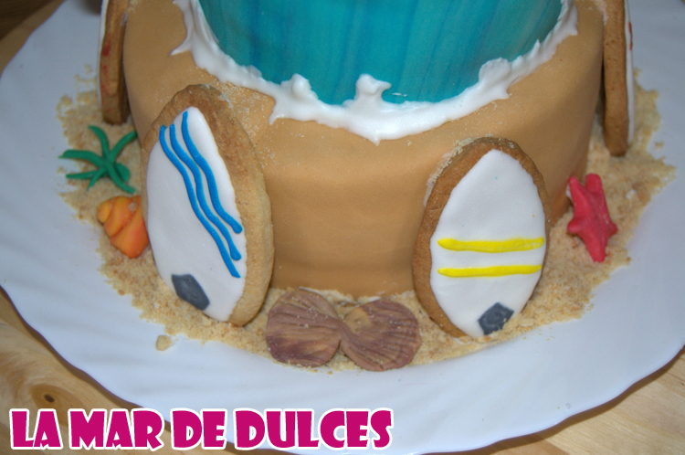 Otras galletas las piqué y me sirvieron para simular la arena, sobre la que puse las conchas, caracolas y estrellas, y las tablas de surf, como cuando los surferos las dejan en la arena al salirse del agua o antes de entrar.